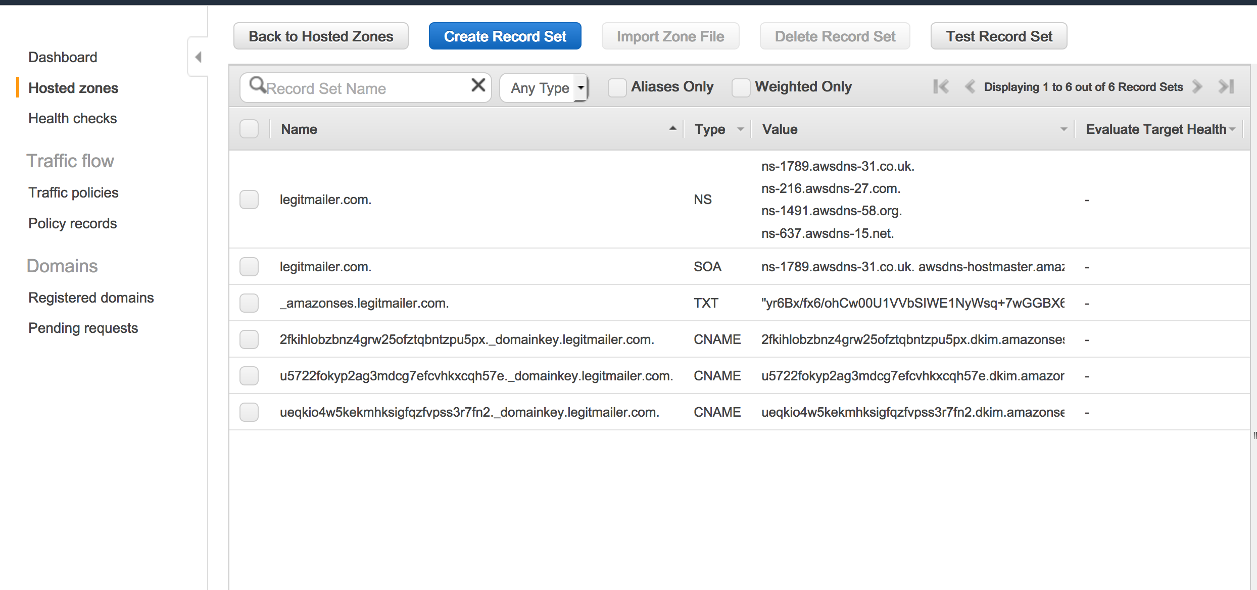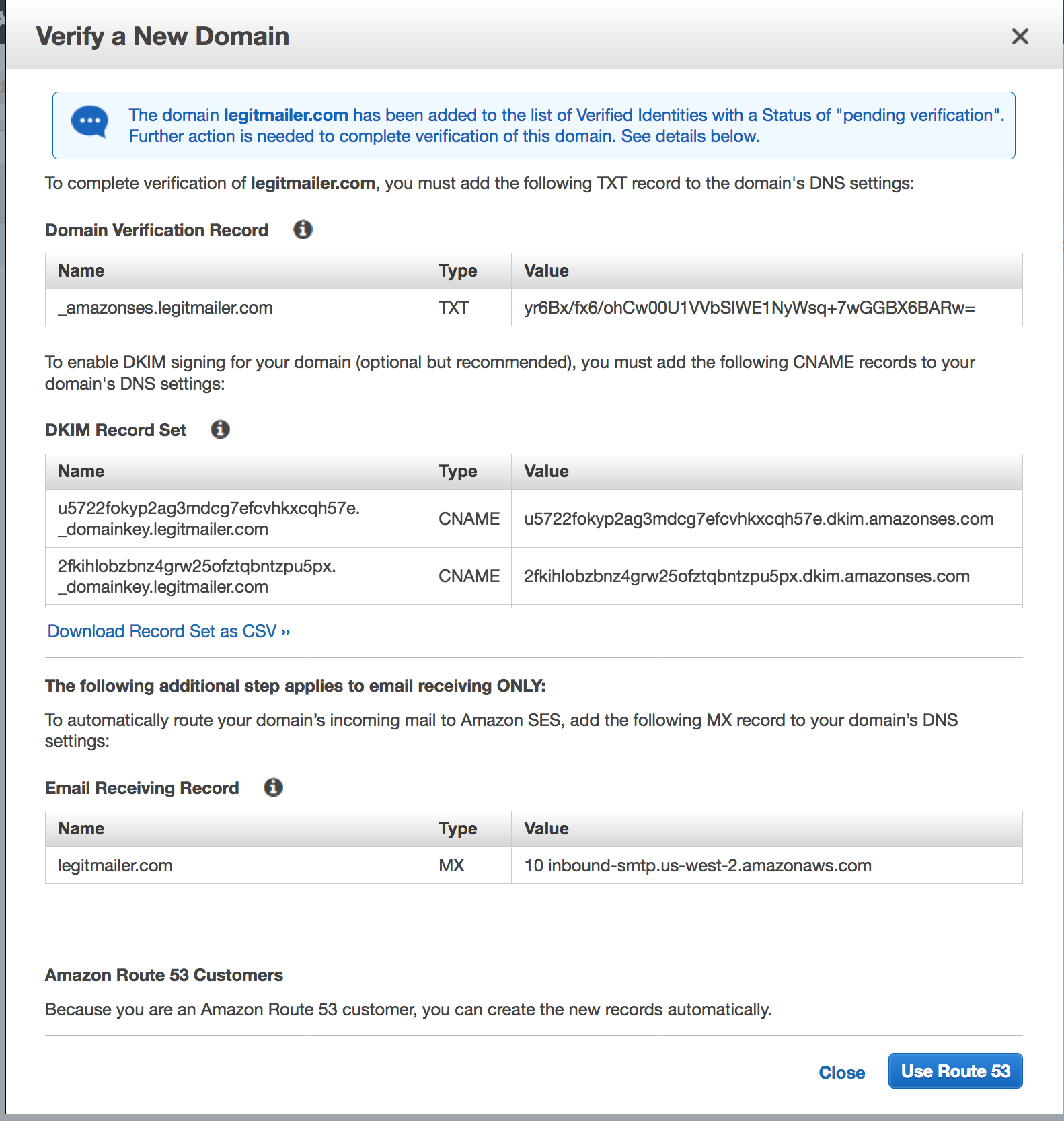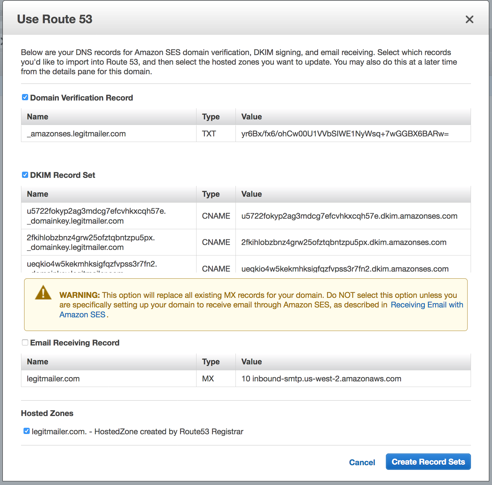 Open Services -> Networking & Content Delivery -> Route 53 and select the Domain Verfication Record & DKIM Record set to import into Route 53.