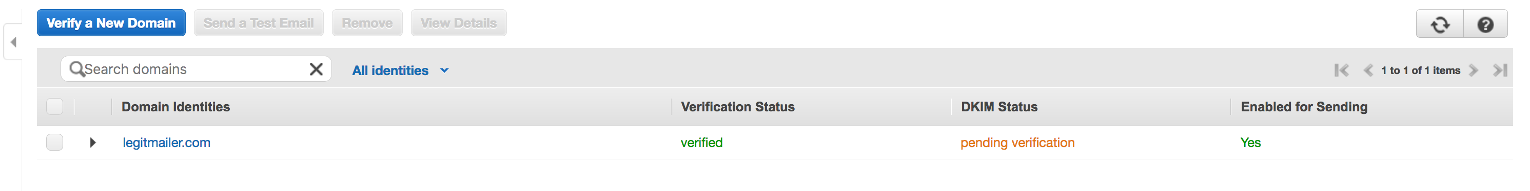 Go to Services -> Customer Engagement -> Simple Email Service -> Domains You will see you are ready to send emails.